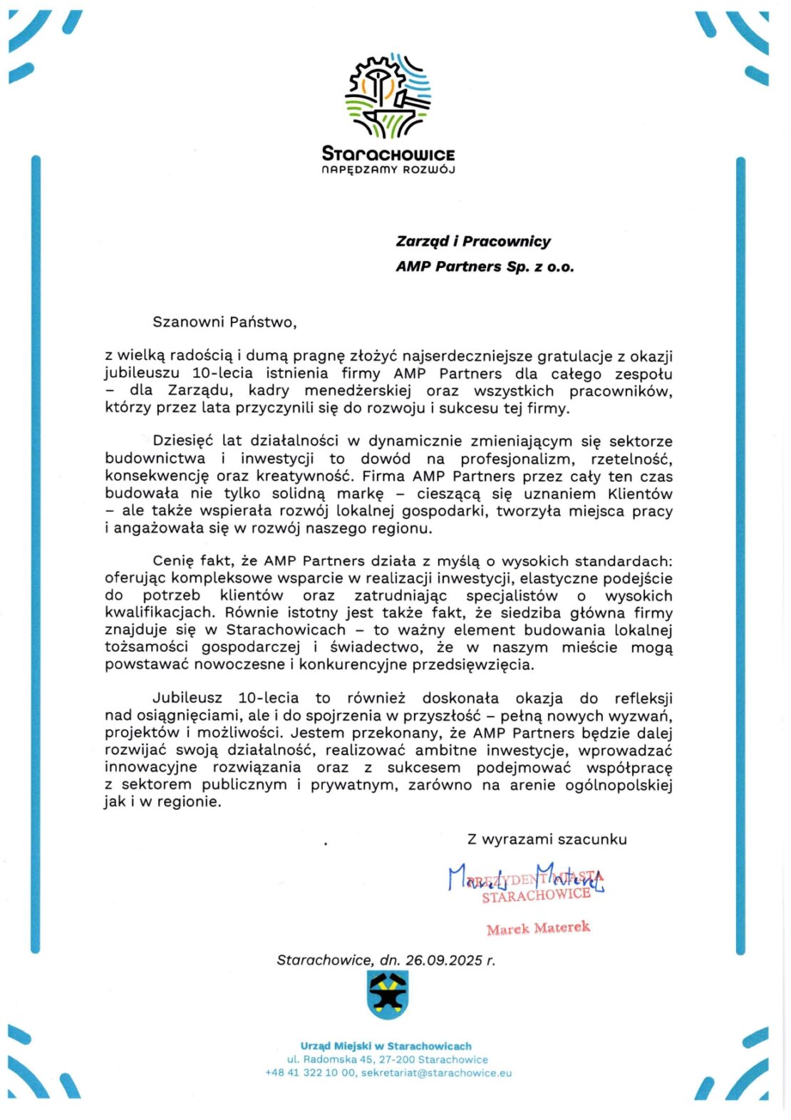 Z tej okazji otrzymaliśmy piękne gratulacje od Prezydenta Miasta Starachowice – Marka Materka. To dla nas wielki zaszczyt i dowód, że nasze starania mają realny wpływ na rozwój regionu.